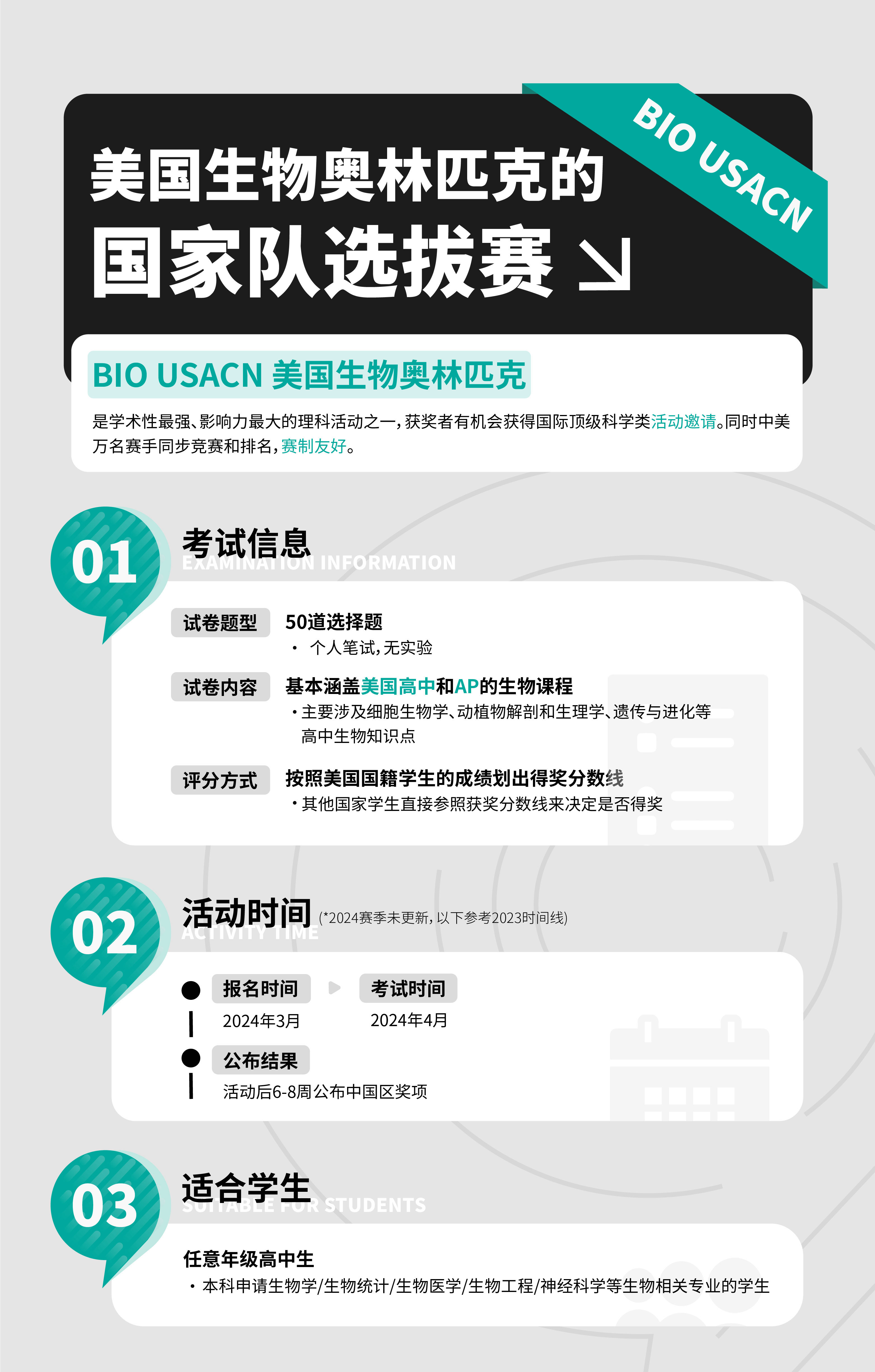USA Biology Olympiad美国中学生生物奥林匹克活动,在2016年将BIO USACN美国生物奥林匹克活动引入中国。近年来,美国大学的医学、生物医学、生物基因等学科成为申请热门专业,而BIO USACN美国生物奥林匹克活动作为美国学术性强、影响力大的理工科活动之一,在BIO USACN中取得的优异成绩的学生成为这些提供相关专业的重要申请优势。获奖同学将有机会获得参加国际科学类活动的邀请,且不少学生高中毕业后进入美国常春藤学校。