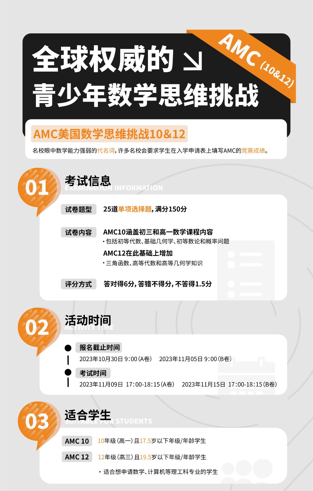 AMC是由美国数学协会MAA举办的一系列挑战赛,目前每年有来自全球超过6000所学校的30万名学生参与,在全球范围内具有一定影响力。AMC系列活动涵盖AMC8、AMC10、AMC12、AIME、USA(J)MO、IMO。对于大陆学生来说,可参与到的最高阶段是AIME美国数学邀请赛。