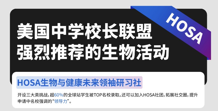 HOSA生物与健康未来领袖研习社(HOSA-Future Health Professionals)是全球极具影响力的生物与健康领域学生活动平台。HOSA 成立至今已有46年历史,其活动活动及学生组织获得美国教育部及全球上百家顶尖健康医疗企业机构认证,并在全球范围内拥有超过 5600 个会员学校,每年吸引超过 25 万名学生参加,累计影响超过 300 万名学生。